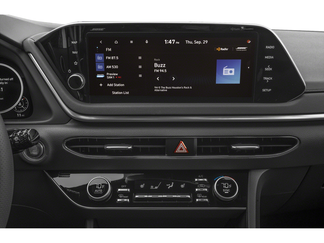 - Radio: AM/FM/MP3/HD/SiriusXM Display Audio w/Nav -inc: 10.25" color touchscreen, Bose premium audio w/12 speakers (1 center channel, 2 dash, 2 front tweeters, 4 door mounted, 2 rear mounted speakers plus 1 rear mounted subwoofer), dynamic voice recognition, integrated Bluetooth®, Blue Link connected car system, Apple CarPlay, Android Auto, USB, diversity antenna for navigation and HERE HD traffic